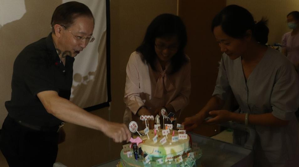 随后,毕业生代表将早已备好的蛋糕推入现场。蛋糕上插着每位毕业生的姓名,寓意“聚是一团火,散是漫天星”。祝愿每一位毕业生都能够在新的工作岗位中发光发热,心想事成。在场的三位老师共同为毕业生们切分蛋糕,并向大家送上祝福。