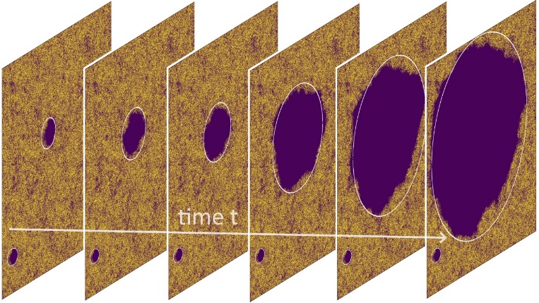 亚稳态损伤传播示意图。底部的破坏小于临界尺寸时,不会扩展;而中部大于临界尺寸的破坏,会随时间推移造成整个系统的崩塌。