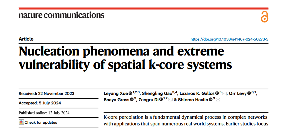 该研究成果7月12日被《Nature Communications》杂志接收并发表,题为“Nucleation phenomena and extreme vulnerability of spatial k-core systems”。研究工作是北京师范大学系统科学学科作为第一单位,与以色列巴伊兰大学等多家学术单位合作完成的。复杂系统国际科学中心、bet365在线体育投注 的博士生薛乐洋同学为论文第一作者,美国罗格斯大学的Lazaros Gallos教授、以色列巴伊兰大学的Shlomo Havlin教授以及北京师范大学的狄增如教授为论文的共同通讯作者。