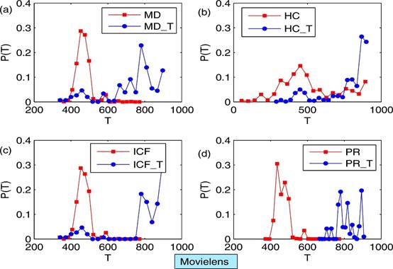 Fig. 4. (Color online) The distribution of Tα in users’ recommendation lists when different recommendation algorithms are applied. The method marked with “T” is the timeliness-based version of the method. The network data used in this figure is Movielens.