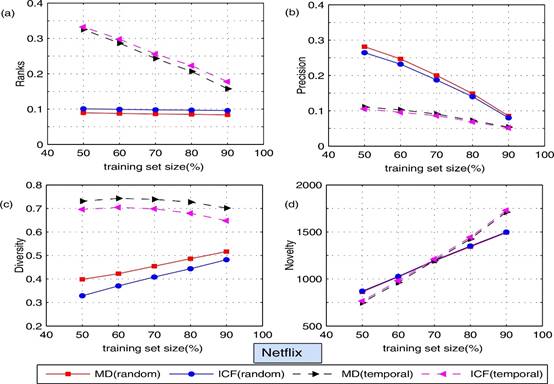 Fig. 3. (Color online) The recommendation performance ((a) ranking score; (b) precision; (c) personalization; (d) surprisal ) of the mass diffusion and item-based collaborative filtering algorithms under the random data division and temporal data division. The network used in this figure is Netflix.