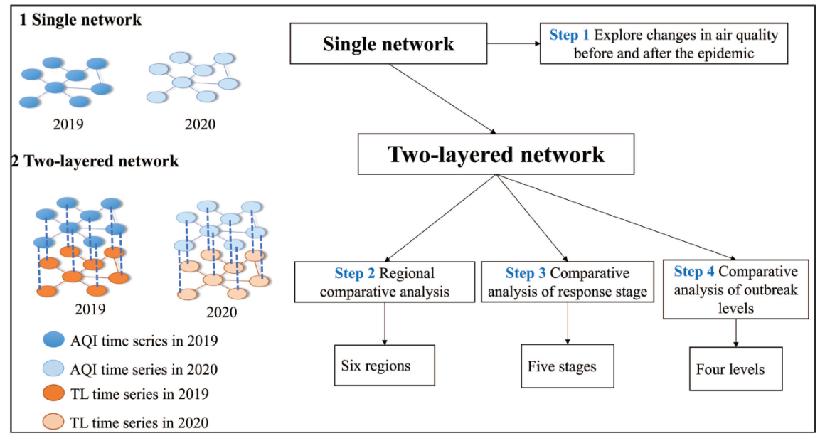为了解决这些问题,作者转向加权气候网络框架,使用 2019 年的大流行前数据和2020年的数据将每个城市建模为一个节点,最终构建了一个包含不同区域、疫情应对阶段和爆发级别的两层网络。