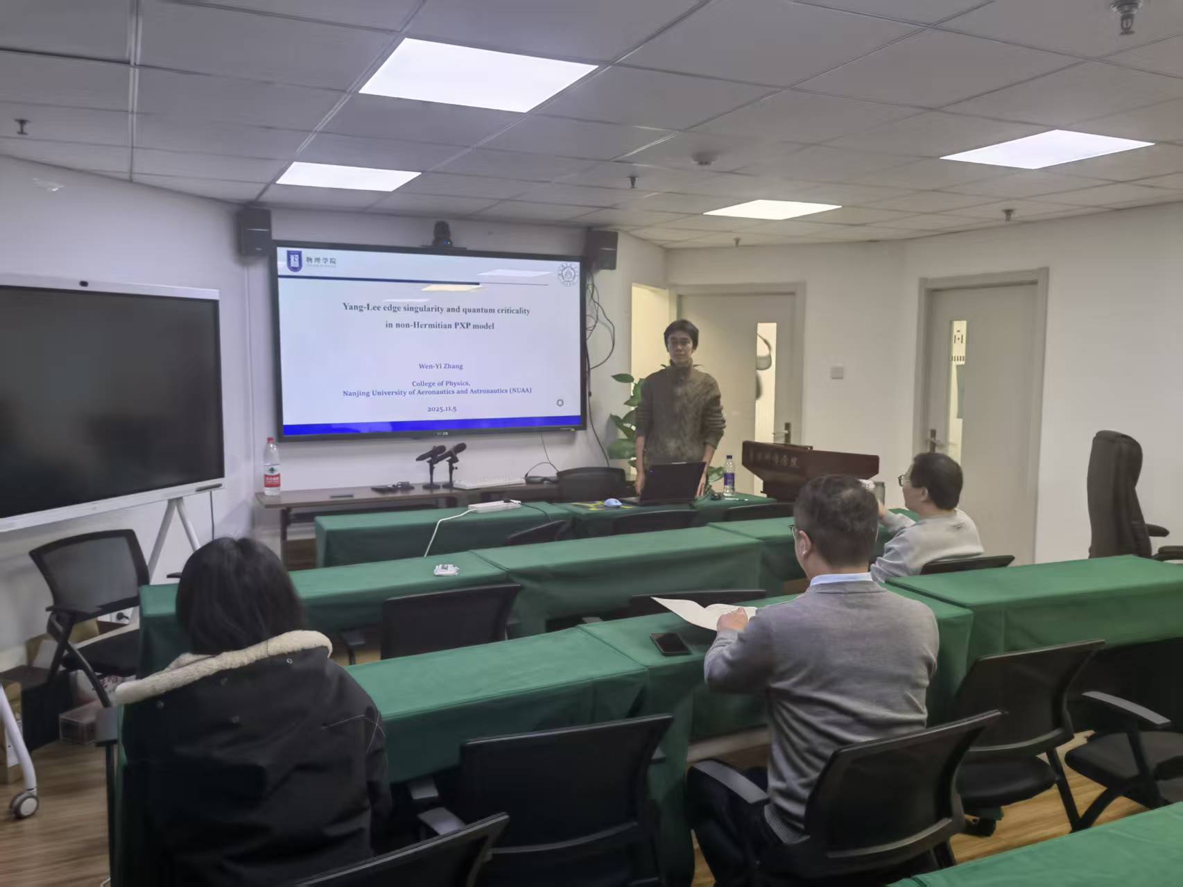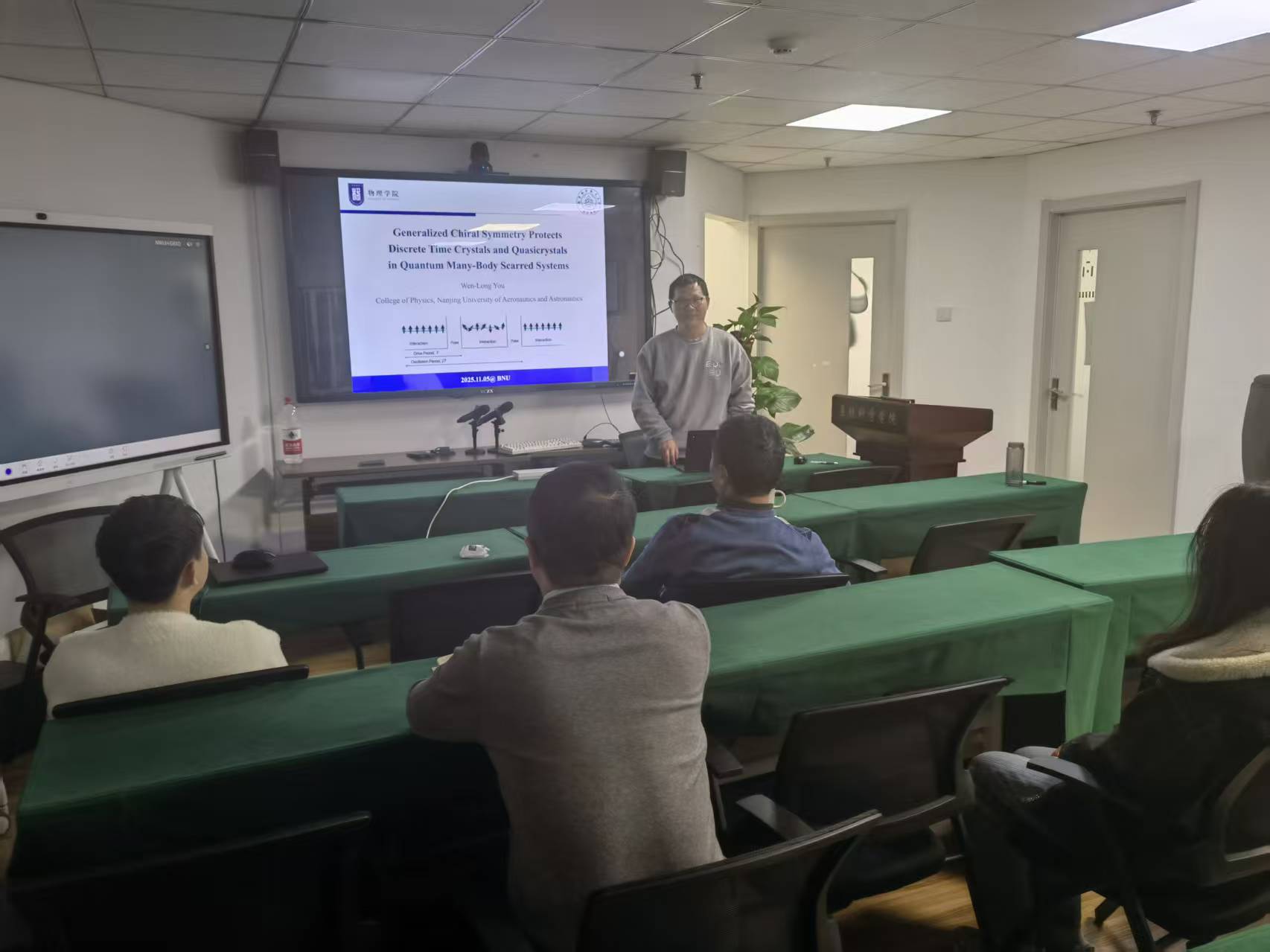 近日,复杂量子系统研究专家南京航空航天大学物理bet365在线体育投注 尤文龙研究员及其团队优秀博士研究生张文乙同学应邀来访我院,围绕量子复杂系统领域开展学术交流,并于2025年11月5日上午和下午为全院师生作了专题讲座。